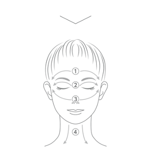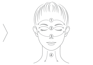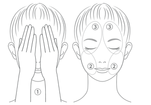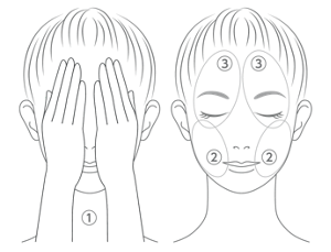 洗顔後、本品を適量手のひらにとり、両手のひら全体で、①顔の中心、②頬、③額と目をおおうようにハンドプレスします。